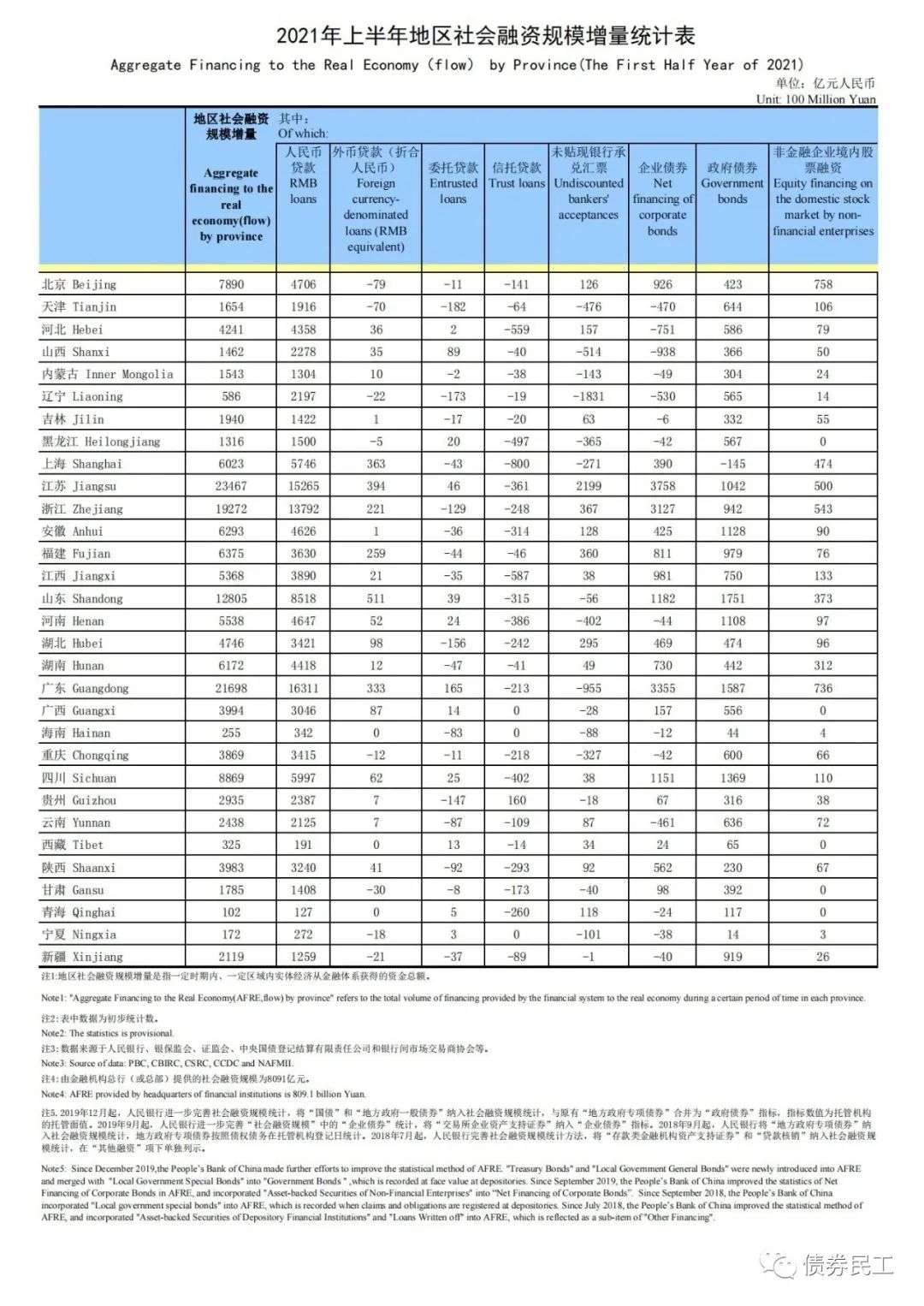 中國人民銀行于2021年8月2日披露了《2021年上半年地區(qū)社會融資規(guī)模增量統(tǒng)計表》,表中詳細披露了各個省市的債券融資增量情況(包括企業(yè)債券、公司債券和非金融企業(yè)債務(wù)融資工具等)。其中部分數(shù)據(jù)還是需要特別關(guān)注的,具體數(shù)據(jù)情況詳見下表: