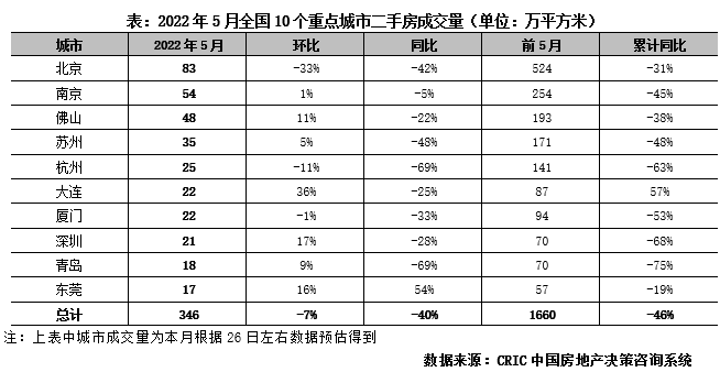 5月二手房市場整體環比再降,10個重點城市預計成交346萬平方米,環比下降7%,同比下降40%。前4月累計成交1660萬平方米,同比下降46%。相比于5月新房30個重點城市預計成交環比增長,二手房市場復蘇略晚。但從同比降幅較4月收窄16pcts來看,市場已向好。