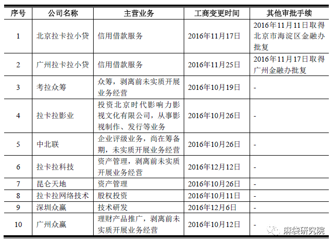 相比前赴后繼的跨界弄潮兒,自帶金融家底的拉卡拉在上市之際卻顯得十分謹慎?;ヂ摼W金融業務曾為一些上市公司帶來高光無限的時刻,卻又在幾年后使得企業深陷泥潭,可謂是“成也蕭何、敗也蕭何”,這樣的例子有熊貓金控、奧馬電器等。在謀劃上市前的2016年,拉卡拉就著手準備了剝離措施。招股說明書顯示,小貸、眾籌和影業等10家子公司被拉卡拉歸為“增值金融業務”,由于發展帶來的不確定性,公司決定剝離,交易價款為14.44億元。2016年10月至12月,下述10家公司已陸續完成變更和相應的審批手續: