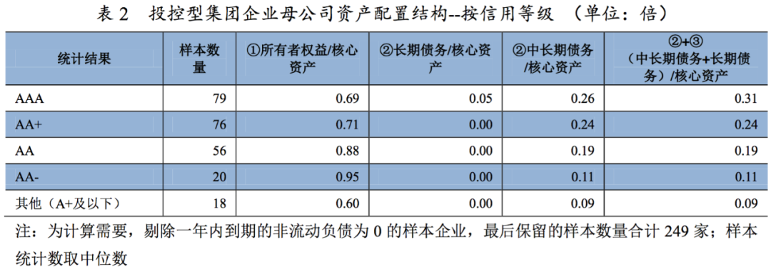 資產負債匹配程度是考察企業財務政策是否穩健的重要指標之一,本文通過對249家不同信用等級的投控型集團企業樣本母公司在資本配置方面的財務表現進行分析發現,高信用等級的企業母公司權益對核心資產的覆蓋程度反而更低,因為外部融資渠道方面的便利使得高信用等級的企業可以靈活選用“權益+杠桿”的模式滿足核心資產配置需要,從而有效控制資金成本、提升資金使用效率;而低信用等級的樣本企業核心資本配置對于自有權益的依賴程度相對較高,一定程度限制其經營規模的擴張;經營策略較為激進的企業甚至采用“短債長投”的策略,加大資金滾續壓力,在外部融資環境收縮的情況下面臨信用風險暴露的風險。