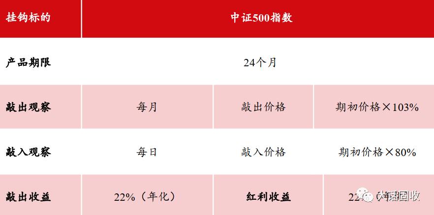 這個產品里面,“西瓜”就是“中證500指數”。敲出和敲入的價格設置為期初價格的103%和80%;“打賭”的收益率定的是22%。