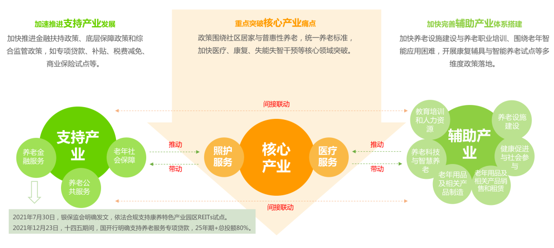 2021年國(guó)家全面啟動(dòng)養(yǎng)老產(chǎn)業(yè)化、體系化政策發(fā)布,重點(diǎn)圍繞核心產(chǎn)業(yè)、支持產(chǎn)業(yè)、輔助產(chǎn)業(yè)的深化改革與產(chǎn)業(yè)培育,啟動(dòng)各細(xì)分領(lǐng)域產(chǎn)業(yè)扶持政策與產(chǎn)業(yè)試點(diǎn)。進(jìn)入2022年,在目標(biāo)政策導(dǎo)向下,各地方將加快推動(dòng)各產(chǎn)業(yè)細(xì)分領(lǐng)域的政策扶持與落地實(shí)施。