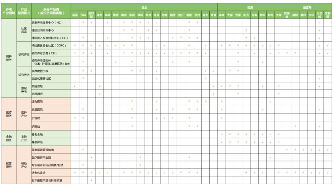 其中,七大投資模式指社區(qū)居家養(yǎng)老、機(jī)構(gòu)養(yǎng)老、綜合養(yǎng)老、旅居養(yǎng)老、醫(yī)護(hù)產(chǎn)業(yè)、支持產(chǎn)業(yè)和輔助產(chǎn)業(yè)。如房企聚集“照護(hù)+醫(yī)療+產(chǎn)業(yè)配套”三大類型,險(xiǎn)資企業(yè)聚集“保險(xiǎn)+醫(yī)養(yǎng)服務(wù)”兩大業(yè)態(tài),運(yùn)營(yíng)商重點(diǎn)圍繞養(yǎng)老運(yùn)營(yíng)管理輸出等。