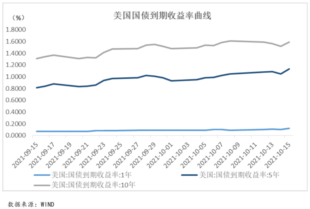 本周美聯(lián)儲(chǔ)鷹派立場(chǎng)對(duì)債券市場(chǎng)的影響仍在持續(xù),同時(shí)周五公布的9月零售數(shù)據(jù)明顯好于預(yù)期,加強(qiáng)了市場(chǎng)對(duì)于美聯(lián)儲(chǔ)提前加息的預(yù)期,各期美債收益率隨即大幅上升。從總體來(lái)看,1年期、5年期和10年期美國(guó)國(guó)債平均收益率分別較上周上漲1.35個(gè)、8.95個(gè)和1.50個(gè)BP至0.11%、1.09%和1.57%。