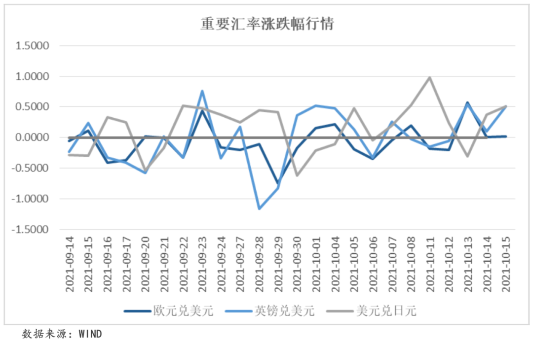 本周,在美元走弱的背景下,歐元和英鎊兌美元均小幅上漲。周內(nèi)歐元兌美元收于1.1599,周內(nèi)累計(jì)收漲0.23%;英鎊兌美元收于1.3744,周內(nèi)累計(jì)收漲0.90%。本周日元持續(xù)疲軟態(tài)勢(shì),一是因?yàn)槭袌?chǎng)維持對(duì)日本寬松貨幣政策的預(yù)期,二是日本發(fā)布的經(jīng)濟(jì)報(bào)告顯示,受半導(dǎo)體和供應(yīng)鏈緊張影響,日本國(guó)內(nèi)經(jīng)濟(jì)改善勢(shì)頭有所減弱。本周美元兌日元收于114.2550,周內(nèi)累計(jì)收漲1.80%。