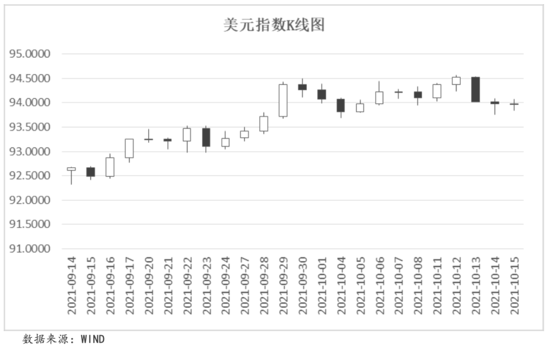 本周,市場(chǎng)風(fēng)險(xiǎn)偏好上升令美元承壓,美元指數(shù)結(jié)束連續(xù)五周的上漲趨勢(shì)。本周發(fā)布的美國(guó)9月零售數(shù)據(jù)遠(yuǎn)超市場(chǎng)預(yù)期,顯示美國(guó)經(jīng)濟(jì)持續(xù)向好;同時(shí)本周迎來(lái)美國(guó)財(cái)報(bào)季,多家企業(yè)發(fā)布的財(cái)報(bào)數(shù)據(jù)好于預(yù)期,提升了投資者信心,市場(chǎng)情緒持續(xù)轉(zhuǎn)暖。截至本周五,美元指數(shù)收于93.9657,周內(nèi)累計(jì)下跌0.15%。