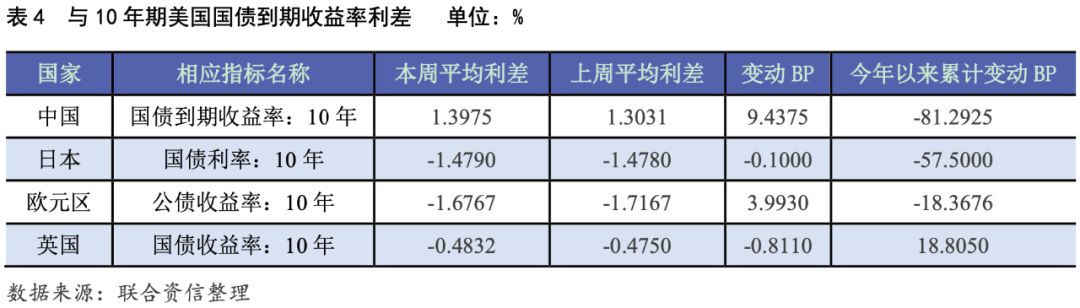 本周各期限中美國(guó)債平均收益率利差走勢(shì)不一,1年期中美國(guó)債平均收益率利差較上周收窄2.27個(gè)BP至2.23%;5年期和10年期中美國(guó)債平均收益率利差分別較上周走擴(kuò)2.47個(gè)和9.44個(gè)BP至1.72%和1.40%。本周1年期、5年期和10年期日美國(guó)債平均收益率利差分別較上周走擴(kuò)1.82個(gè)、8.11個(gè)和0.10個(gè)BP至-0.23%、-1.16%和-1.48%。本周1年期和10年期歐元區(qū)公債與相應(yīng)期限美債平均收益率利差分別較上周收窄0.02個(gè)和3.99個(gè)BP至-0.83%、-1.68%;5年期歐元區(qū)公債與相應(yīng)期限美債平均收益率利差較上周走擴(kuò)2.29個(gè)BP至-1.58%。本周5年期和10年英美國(guó)債平均收益率利差分別較上周收走擴(kuò)2.62個(gè)和0.81個(gè)BP至-0.34%和-0.48%。