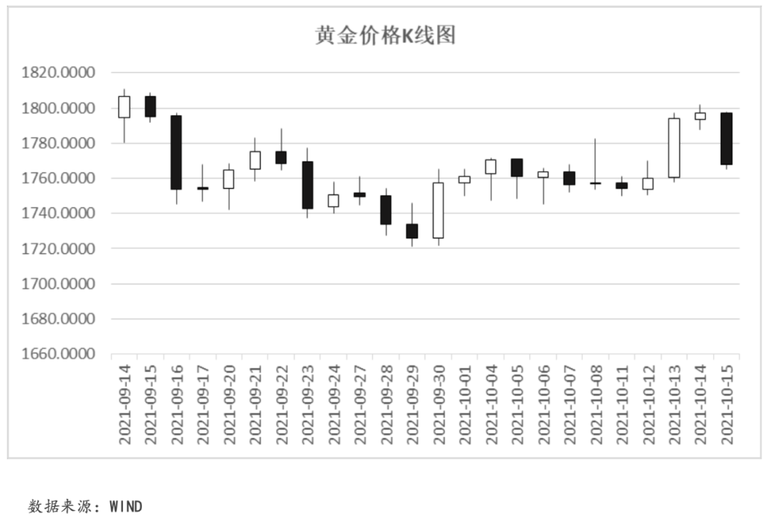本周,上半周受美債收益率下行推動(dòng)黃金價(jià)格上漲,周五公布的9月美國(guó)零售數(shù)據(jù)推升美債收益率,黃金價(jià)格承壓下降,但未能扭轉(zhuǎn)此前的漲勢(shì)。截至本周五,COMEX黃金價(jià)格收于1,768.10美元/盎司,周內(nèi)累計(jì)收漲0.61%,扭轉(zhuǎn)了連續(xù)四周的下跌趨勢(shì)。