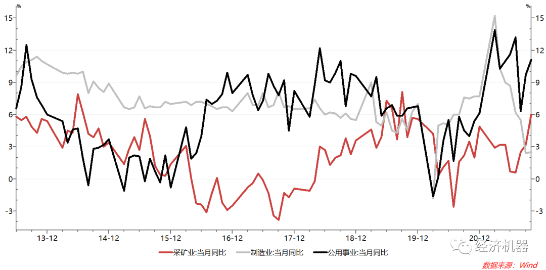 1)保供下,電力公用事業(yè)景氣提高,助推工業(yè)增加值增速企穩(wěn)回升。10月份工業(yè)增加值當(dāng)月同比增長3.5%,自上月的3.1%的低點(diǎn)回升,也好于市場(chǎng)3.2%的預(yù)期。分項(xiàng)來看,制造業(yè)增加值增長2.5%,和上月增速基本持平;采礦業(yè)增加值同比增長6%,較上月加速2.8pct;電力等公用事業(yè)同比增長11.0%,較上月加速1.4pct。在能源保供下,煤炭等采礦業(yè)和電力等公用事業(yè)部門開足馬力生產(chǎn),對(duì)于工業(yè)增加值的企穩(wěn)回升起到了關(guān)鍵支撐作用。中下游制造業(yè)則受“限電”等影響,幾乎沒有改善。中下游多