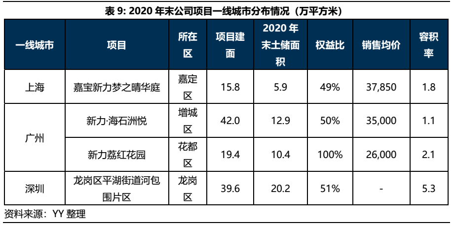 聚焦二三線,同時下沉部分四線。按城市能級看,公司進入的一線城市僅有廣州(23.3萬平方米,占比1.5%)、深圳(20.2萬平方米,占比1.3%)和上海(5.9萬平方米,占比0.4%),各自僅有1-2個項目,且全部位于非中心城區??紤]到2020年度公司在一線城市并無新增拿地,公司可能尚無深入一線城市的打算,一線城市項目用來提高知名度的意義更大。