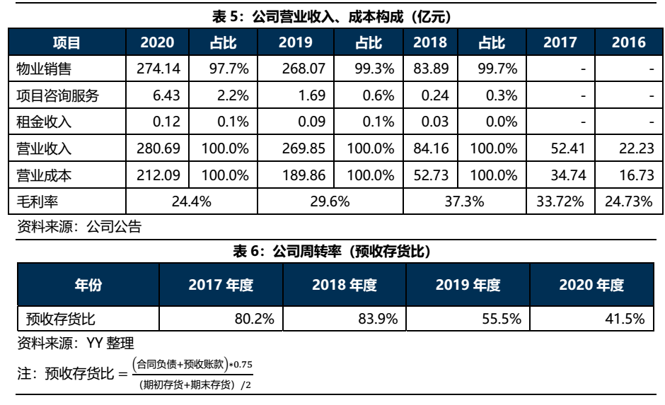 公司營業收入主要包括物業銷售、項目咨詢服務以及租金收入,2020年度物業銷售收入占營收比重達97.7%,是公司最主要的收入來源??梢钥吹?016年以來公司營收規模不斷擴大,但2020年增速下降明顯,同時2018年以來毛利率水平與周轉率持續下降。