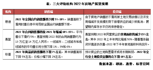 鑒于銷售前景疲弱、政策等限制,三大機構均預測2022年投資端將明顯下滑。其中標普預計2022年全行業土地投資金額將會下滑10%左右。惠譽預期2022年全年民營房企的拿地面積將減少15%左右。