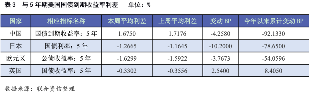 本周各期限中美國債平均收益率利差走勢不一,1年期中美國債平均收益率利差分別較上周走擴2.20個BP至2.25%;5年期和10年期中美國債平均收益率利差分別較上周收窄4.26個和4.03個BP至1.68%和1.36%。本周1年期、5年期和10年期日美國債平均收益率利差分別較上周走擴0.63個、10.20個和8.85個BP至-0.23%、-1.27%和-1.57%。本周1年期歐元區(qū)公債與相應期限美債平均收益率利差分別較上周收窄1.80個BP至-0.82%;5年期和10年期歐元區(qū)公債與相應期限美債平均收益率利差分別較上周走擴3.77個和5.46個BP至-1.63%和-1.75%。本周5年期英美國債平均收益率利差分別較上周收窄2.54個BP至-0.33%;10年英美國債平均收益率利差分別較上周走擴2.30個BP至-0.52%。