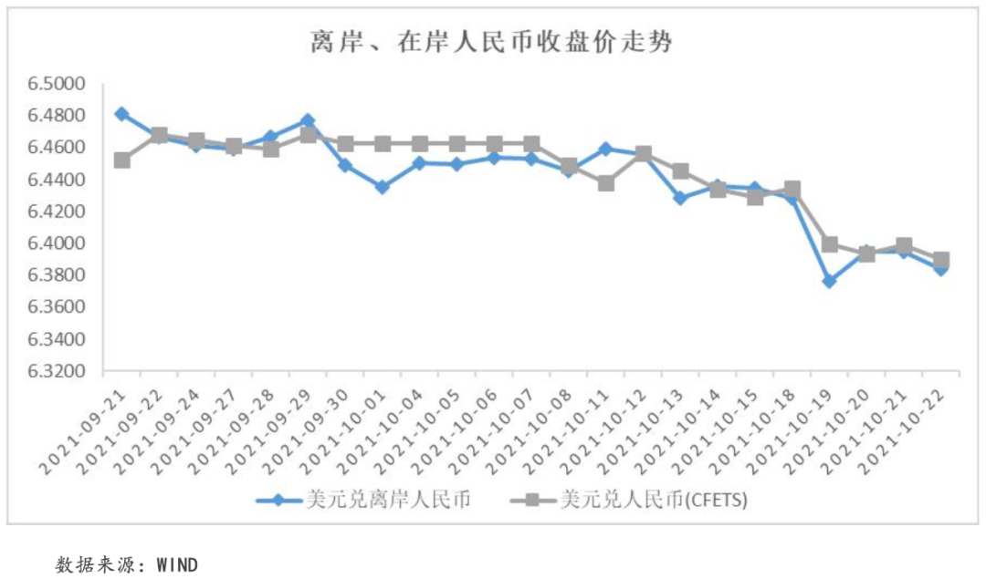 本周,中國三季度GDP增幅同比達4.9%,經濟復蘇持續(xù)穩(wěn)定向好;而美國通脹問題持續(xù),經濟恢復不確定性增加。因此,在岸和離岸人民幣匯率均呈現(xiàn)波動走強態(tài)勢。截至周五,美元兌離岸人民幣匯率收于6.3839,周內小幅下跌0.79%;美元兌在岸人民幣匯率收于6.3903,周內累計收跌0.66%。