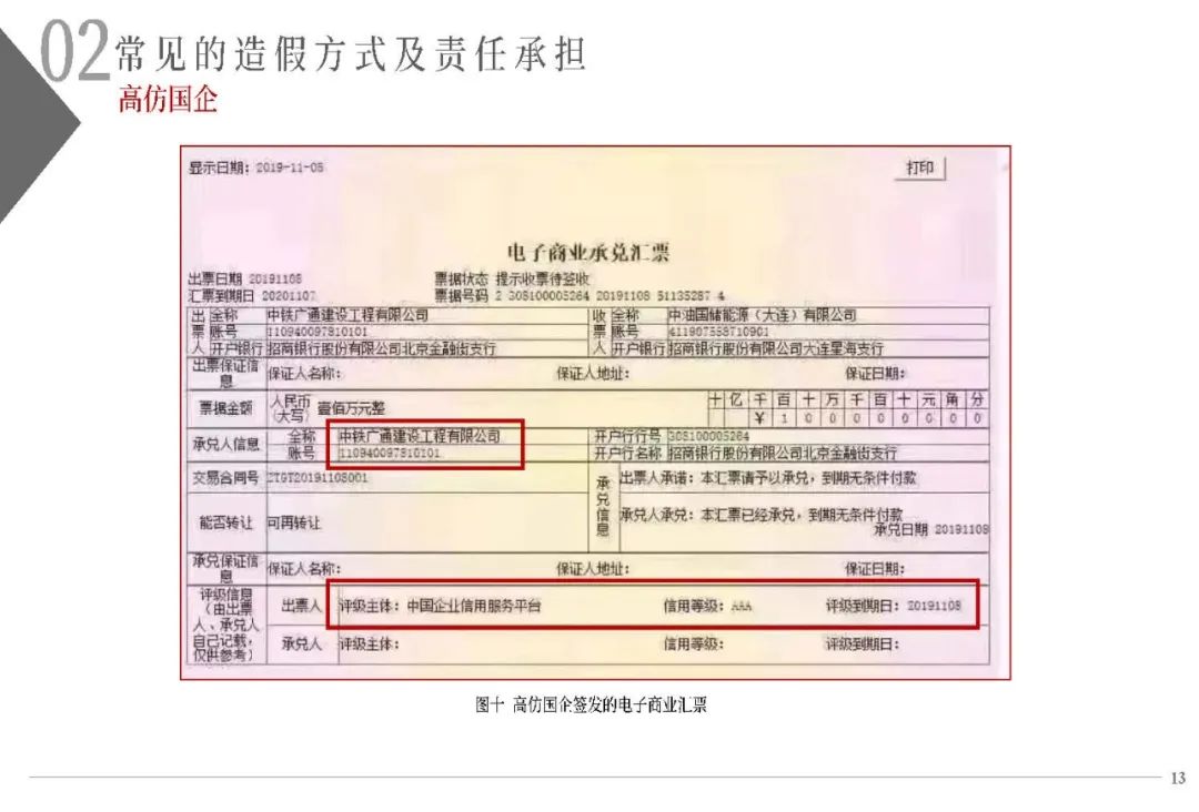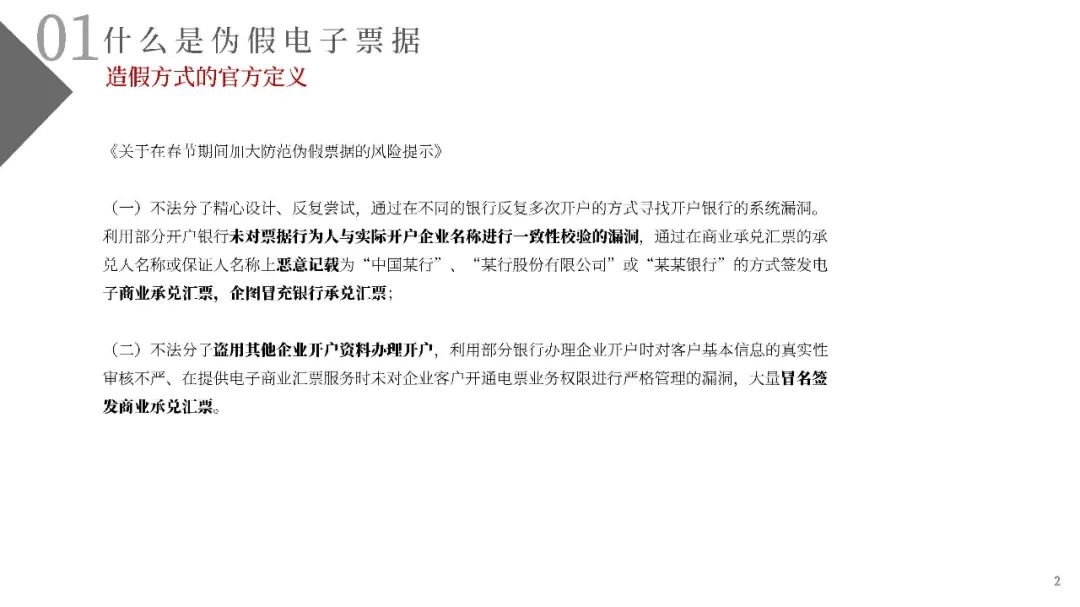 (一)不法分子精心設計、反復嘗試,通過在不同的銀行反復多次開戶的方式尋找開戶銀行的系統漏洞。利用部分開戶銀行未對票據行為人與實際開戶企業名稱進行一致性校驗的漏洞,通過在商業承兌匯票的承兌人名稱或保證人名稱上惡意記載為“中國某行”、“某行股份有限公司”或“某某銀行”的方式簽發電子商業承兌匯票,企圖冒充銀行承兌匯票;