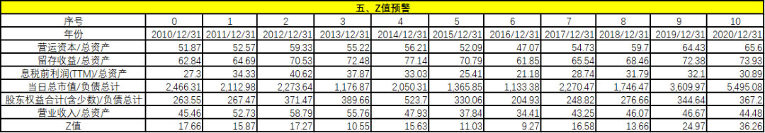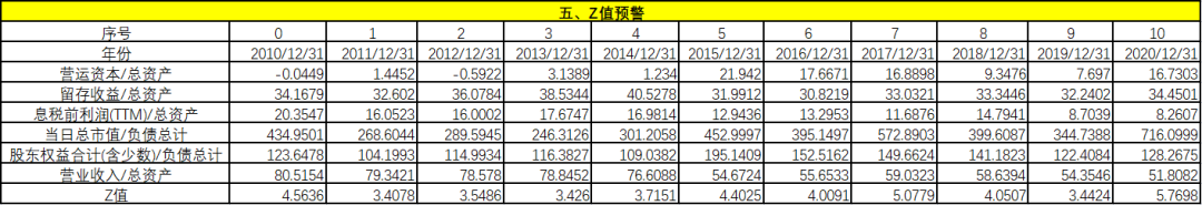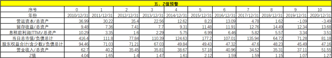從財(cái)務(wù)困境模型上看,Z值用來分析預(yù)測(cè)企業(yè)財(cái)務(wù)失敗或破產(chǎn)的可能性,Z值越低,企業(yè)越有可能發(fā)生破產(chǎn)。通過計(jì)算某企業(yè)連續(xù)若干年的Z值可以發(fā)現(xiàn)企業(yè)是否存在財(cái)務(wù)危機(jī)的征兆,一般來說,當(dāng)Z值大于2.675時(shí),則表明企業(yè)的財(cái)務(wù)狀況良好,發(fā)生破產(chǎn)的可能性就小;當(dāng)Z值小于1.81時(shí),則表明企業(yè)潛伏著破產(chǎn)危機(jī);當(dāng)Z值介于1.81和2.675之間時(shí)被稱之為“灰色地帶”,說明企業(yè)的財(cái)務(wù)狀況極為不穩(wěn)定。