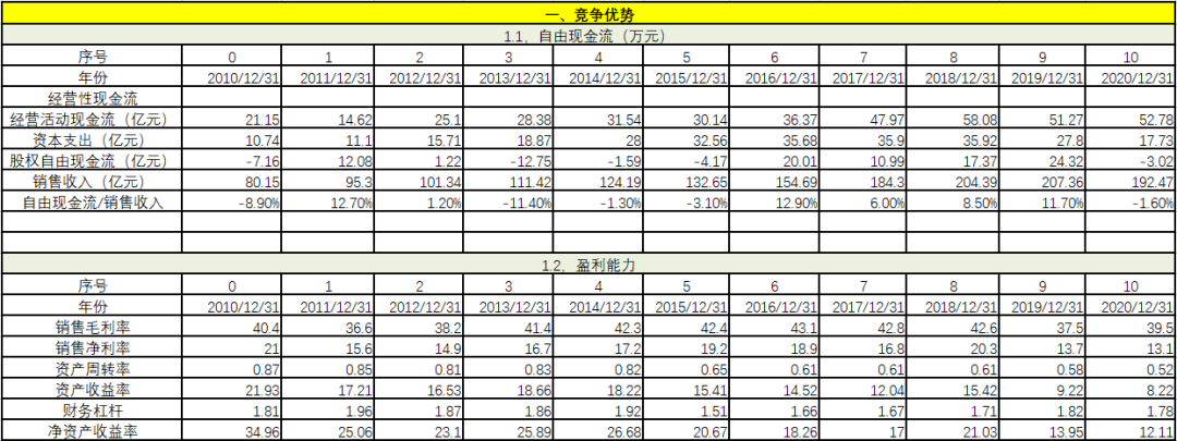 從競(jìng)爭(zhēng)優(yōu)勢(shì)上看,自由現(xiàn)金流/銷售收入在過去11年中有1年為負(fù),剩余10年都遠(yuǎn)遠(yuǎn)大于5%,經(jīng)營績效異常穩(wěn)健。毛利率基本不變,維持在90%以上,說明對(duì)上下游都有極強(qiáng)的把控力。在毛利率不變的情況下,凈利率穩(wěn)步提升。資產(chǎn)周轉(zhuǎn)率基本保持不變,說明企業(yè)雖然在變大,但經(jīng)營效率持續(xù)穩(wěn)定。資產(chǎn)收益率和凈資產(chǎn)收益率穩(wěn)步提升,財(cái)務(wù)杠桿略有下降。從這些指標(biāo)可以看出,該企業(yè)的競(jìng)爭(zhēng)優(yōu)勢(shì)非常明顯。