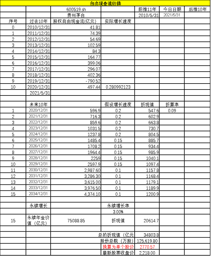 貴州茅臺(tái)全部內(nèi)在價(jià)值為3.48萬億元,折合單個(gè)股票價(jià)格為2770.57元,截止到2021年5月31日,貴州茅臺(tái)的收盤價(jià)為2218元,遠(yuǎn)遠(yuǎn)低于其內(nèi)在價(jià)值。