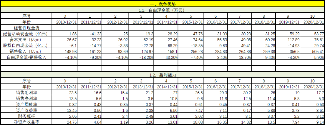 從競(jìng)爭(zhēng)優(yōu)勢(shì)上看,自由現(xiàn)金流/銷售收入在過去11年中有6年為負(fù),并且僅有4年大于5%,經(jīng)營績效并不穩(wěn)健。相對(duì)于經(jīng)營活動(dòng)現(xiàn)金流,資本開支過大,也就是說,企業(yè)自己的造血功能不足以支撐企業(yè)的長遠(yuǎn)發(fā)展,有一定的危險(xiǎn)性。