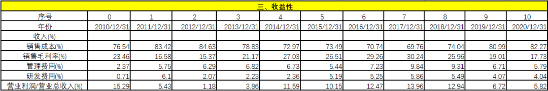 從收益性上看,管理費(fèi)率提升后有所壓縮,說明企業(yè)意識(shí)到非生產(chǎn)條線的薪酬增長過快,影響了利潤,因此有所壓降。研發(fā)費(fèi)用處于穩(wěn)定狀態(tài)。但,營業(yè)利潤/營業(yè)總收入近期下降得比較多。