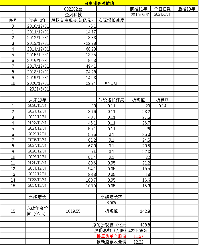雖然金風(fēng)科技名氣非常大,但我們不得不正視現(xiàn)實(shí)。自由現(xiàn)金流估值模型給出的總估值為488.82億元,換算成個(gè)股,股價(jià)為11.57元,接近于2021年5月31日12.22元的收盤價(jià)。