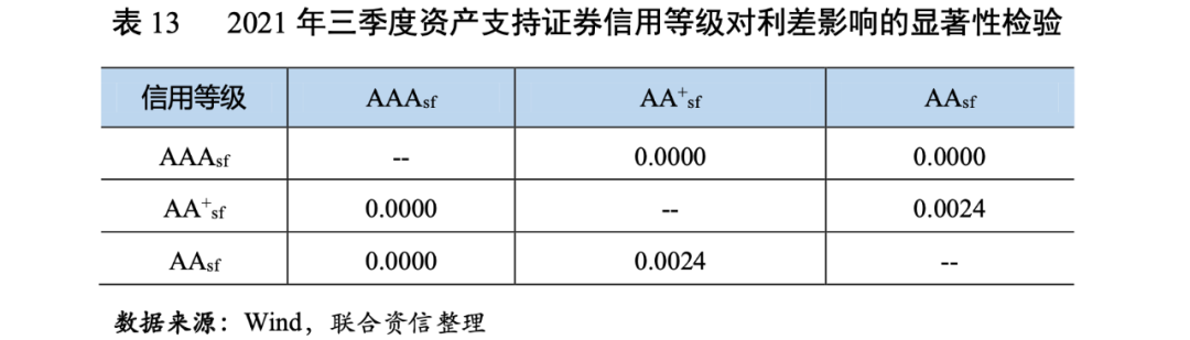 為了檢驗信用等級對資產支持證券發行利差影響的顯著性,我們采用了Mann-Whitney U 兩獨立樣本非參數檢驗方法,對AAAsf、AA+sf和AAsf級兩兩之間的利差分布進行顯著性檢驗。2021年三季度,在95%的置信水平下,AAAsf級和AA+sf級、AAAsf級和AAsf級之間、AA+sf級和AAsf級之間均通過檢驗,具有顯著性差異。整體來看,信用等級對發行利差具有區分性,評級結果得到了投資者認可(表13)。