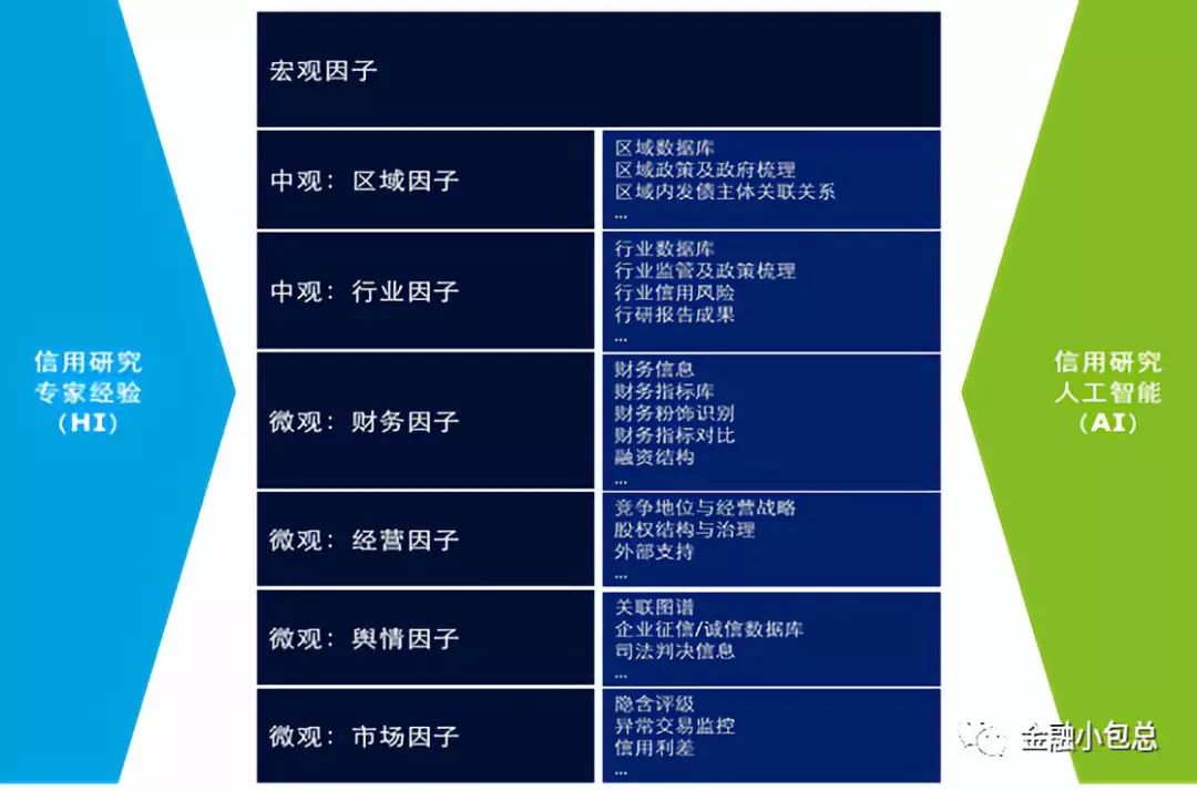 內(nèi)評體系化建設(shè)的核心落腳點在于提升團隊的風(fēng)險識別、風(fēng)險計量、風(fēng)險緩釋及處置能力。風(fēng)險識別是信用風(fēng)險評估入口的問題,風(fēng)險計量是信用風(fēng)險評估出口的問題。信用風(fēng)險的評估環(huán)節(jié)入口應(yīng)綜合專家經(jīng)驗和人工智能兩套方法論,而信用評估的出口環(huán)節(jié)精細(xì)化信用研究成果如下圖所示: