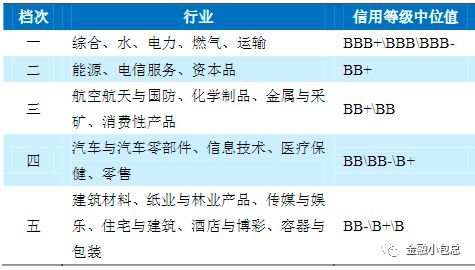 宏觀和行業(yè)維度看,大致可以分為三塊工作。第一是充分借鑒賣方行業(yè)研究的成果。第二是針對行業(yè)信用風(fēng)險,梳理各行業(yè)信用研究的邏輯框架,抓住行業(yè)信用的顯著特性,監(jiān)控每年度行業(yè)信用風(fēng)險的變化,并根據(jù)行業(yè)景氣度確定行業(yè)中長期級別中樞??蓞⒖寄碌?、標(biāo)普、惠譽給予不同行業(yè)敞口不同信用評級中樞的做法,如下圖: