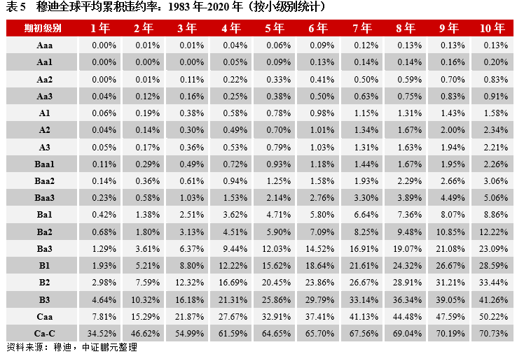 2.相較于穆迪全球,我國高級別違約率偏高,低級別違約率偏低,呈“平坦”化分布。AAA的各年限違約率較穆迪均偏高,且第一年就有違約,而穆迪在第二年后才出現違約;低評級方面,例如:國內B級8年期平均累積違約率為21.74%,低于穆迪的29.65%。這說明相較于穆迪的國際評級序列來說,我國部分高評級主體的級別是虛高的,其實際信用風險高于其評定級別的信用風險定義,應降低這部分主體的評級級別,從而使高級別違約率回歸至合理水平。而低級別違約率偏低,一是因為樣本不足,統計結果的統計意義不強;二是跟早年我國信用債券市場的“剛兌”思想有關,部分低評級主體在各方協調下最終兌付,使得低評級違約率較全球水平來說偏低;另外,當虛高級別主體的評級下調后,一定程度上也會提升低評級違約率。