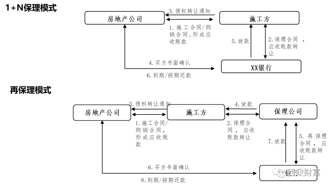 銀行的房地產(chǎn)保理業(yè)務(wù)一般是施工企業(yè)/材料供應(yīng)商為房地產(chǎn)開(kāi)發(fā)商提供施工/貨物服務(wù)形成應(yīng)收賬款后,將對(duì)房地產(chǎn)開(kāi)發(fā)商的合格應(yīng)收賬款轉(zhuǎn)讓給銀行,由銀行為施工企業(yè)提供集應(yīng)收賬款催收、管理、壞賬擔(dān)保及保理融資于一體的綜合性金融服務(wù)。業(yè)務(wù)模式可分為1+N保理模式和再保理模式。