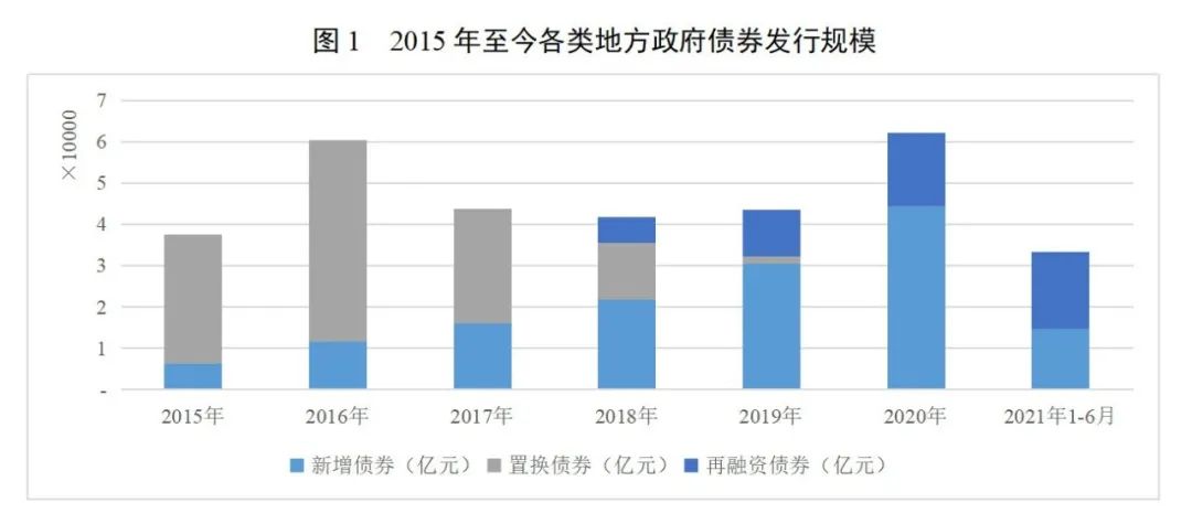 按照前期化解地方政府存量債務(wù)的安排,2015至2017年發(fā)行的地方債中以置換債券為主,2018年新增債發(fā)行規(guī)模超過置換債券和再融資債券規(guī)模;2019年至2020年,地方政府債中主要是新增債券;2021年上半年,再融資債券發(fā)行規(guī)模較大。
