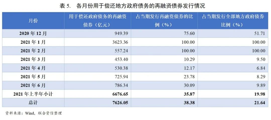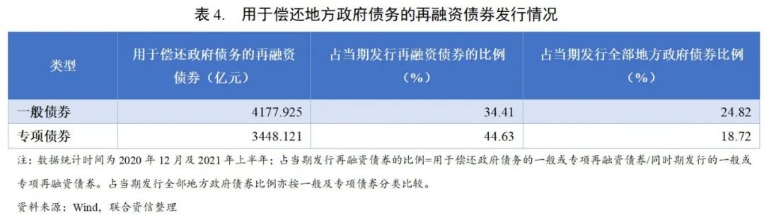 2020年12月及2021年上半年,用于償還政府債務(wù)的一般債券和專項(xiàng)債券分別為4177.93億元和3448.12億元,分別占同期發(fā)行再融資債券的比例為34.41%和44.63%,分別占同期發(fā)行全部地方政府債券的比例為24.82%和18.72%。化債用途專項(xiàng)債券在再融資債券中的占比相對較高,或由于地方政府隱性債務(wù)的認(rèn)定通常需要保證債務(wù)與公益性項(xiàng)目資產(chǎn)相對應(yīng),因此用于項(xiàng)目投資的專項(xiàng)債券或更適合對非債券形式的債務(wù)進(jìn)行置換。