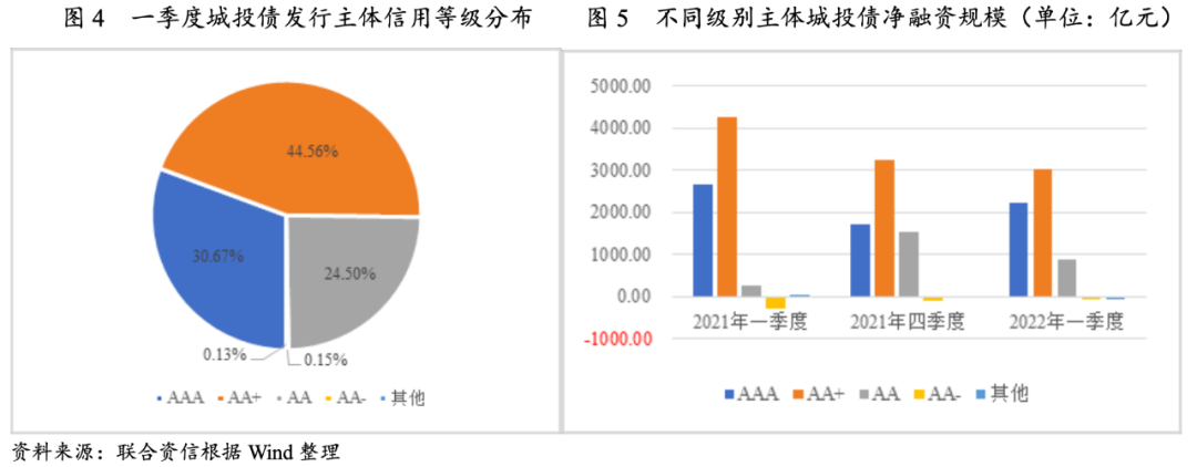 從行政級別來看,二季度到期城投債以地市級和區(qū)縣級城投債為主,占比分別為41.79%、和32.85%。2021年以來,地方政府隱性債務(wù)高壓監(jiān)管下,行政層級較低、信用資質(zhì)較弱的城投企業(yè)融資政策收緊程度更大,區(qū)縣級城投企業(yè)再融資能力有所弱化。四川、山東和福建等地二季度區(qū)縣級城投債到期規(guī)模占比高,均超過35%,同時考慮到一季度區(qū)縣級城投債凈融資規(guī)模明顯收縮,需關(guān)注以上地區(qū)二季度城投債到期兌付壓力。