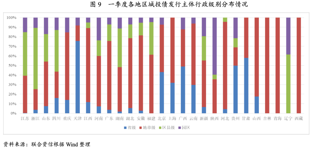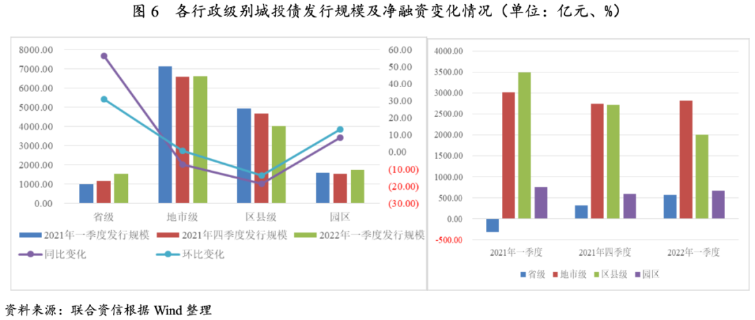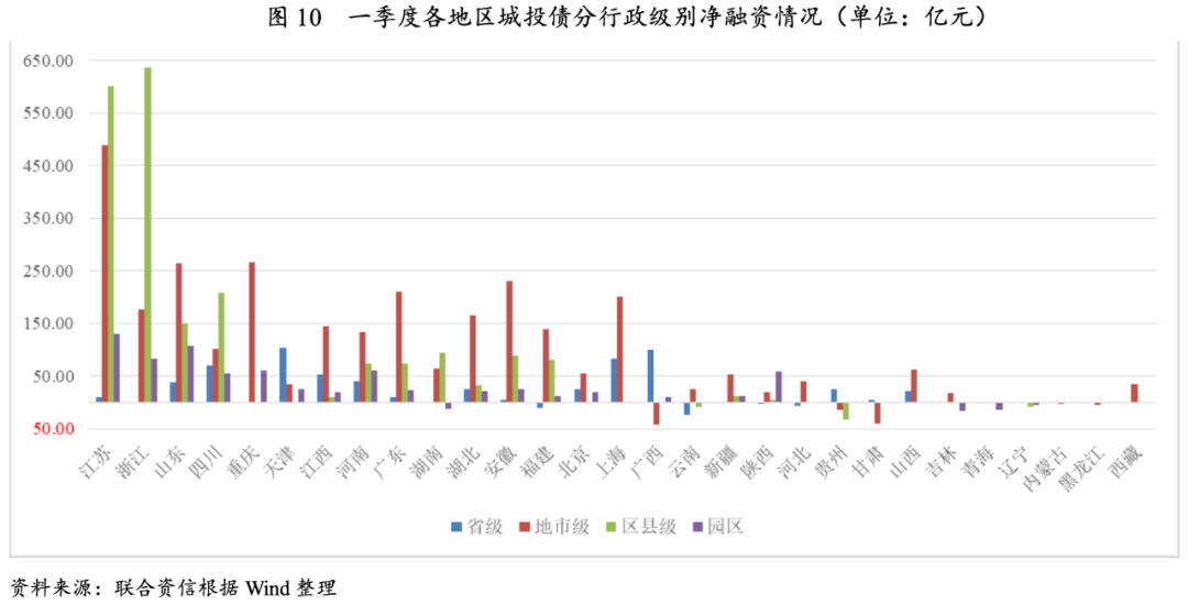 從行政級別上看,地市級和區(qū)縣級主體仍是城投債發(fā)行主力,一季度地市級和區(qū)縣級城投債發(fā)行規(guī)模占比分別為47.62%和28.96%。但區(qū)縣級主體發(fā)債受監(jiān)管限制影響更大,城投債發(fā)行規(guī)模同比和環(huán)比均呈萎縮態(tài)勢,降幅分別為18.55%和13.69%;省級主體發(fā)行規(guī)模同比和環(huán)比均快速擴張,增幅分別為56.22%和30.90%。凈融資方面,區(qū)縣級城投債凈融資規(guī)模同比和環(huán)比分別下降42.53%和25.91%,降幅顯著。