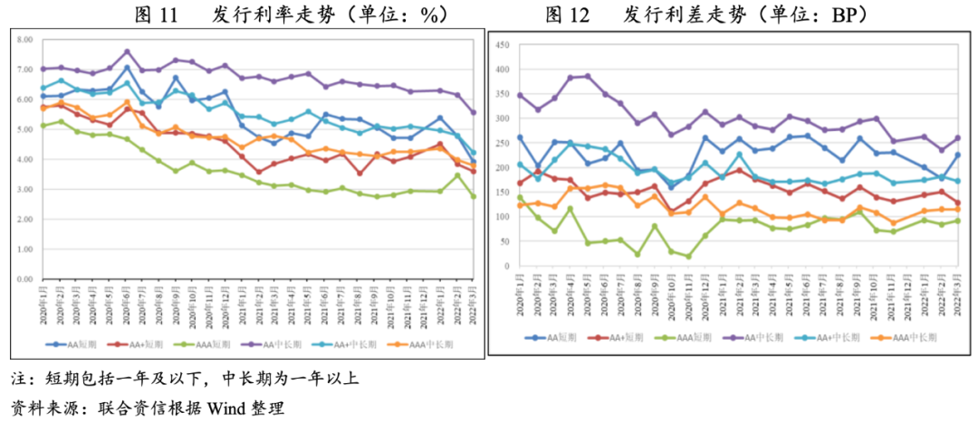 受益于穩(wěn)健貨幣政策的持續(xù)實施,2022年一季度,城投債發(fā)行利率和發(fā)行利差整體延續(xù)2021年的下行趨勢。分級別來看,除AA級和AA+級中長期城投債發(fā)行利率持續(xù)下降外,其他各等級城投債發(fā)行利率均表現(xiàn)為“先升后降”的倒“V”態(tài)勢;AA+級中長期和AAA級城投債發(fā)行利差表現(xiàn)較為平穩(wěn),AA級城投債發(fā)行利差呈“先降后升”的“V”型走勢。