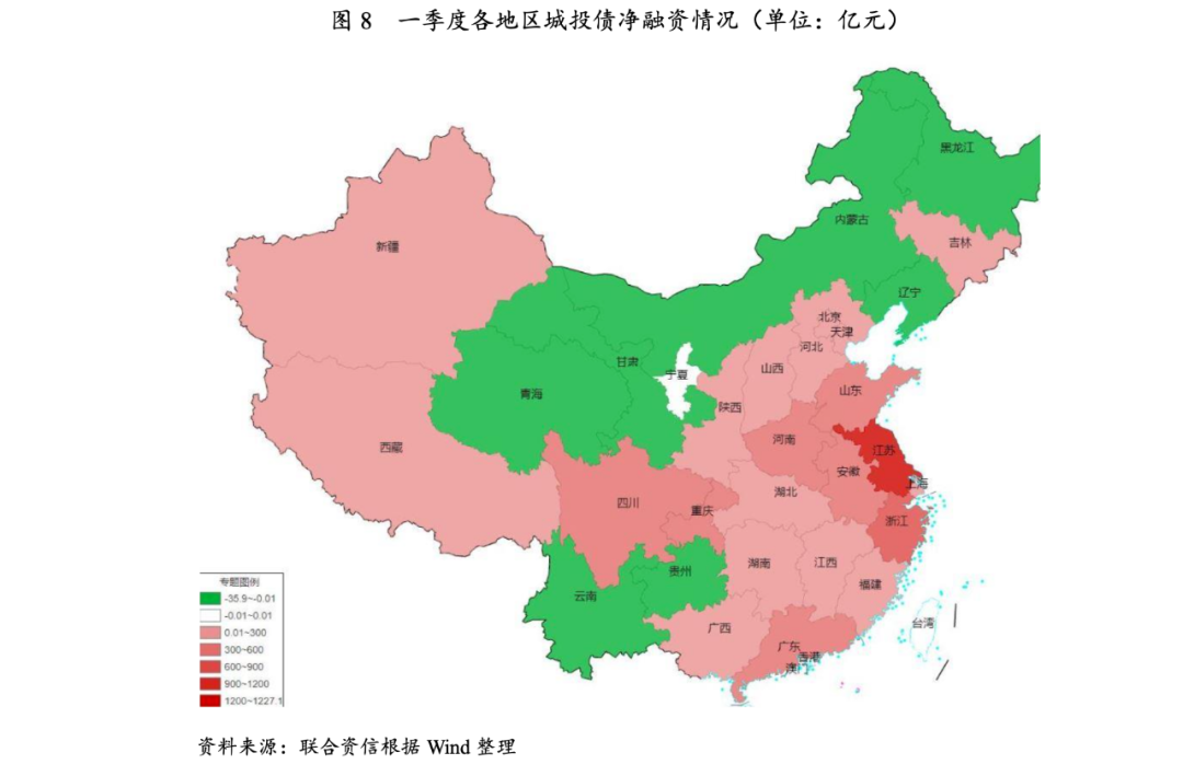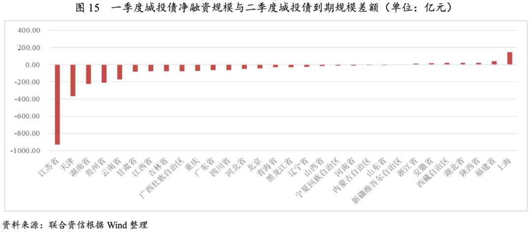 一季度城投債凈融資僅為二季度到期城投債規(guī)模(考慮含權(quán),下同)的0.72倍。具體來看,各省份差異較大,大部分省份一季度城投債凈融資無法覆蓋二季度到期規(guī)模,江蘇、天津、湖南、貴州和云南差額較大。