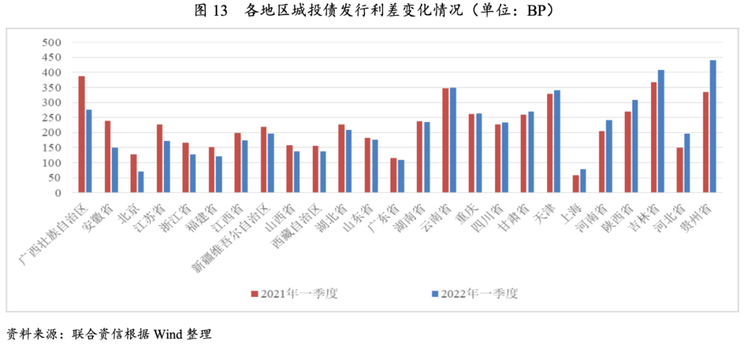分區(qū)域來看,貴州、河南和陜西城投債整體發(fā)行利率同比上升,其他地區(qū)城投債發(fā)行利率均呈不同程度的下降。發(fā)行利差方面,貴州、河北、吉林、陜西和河南等地城投債發(fā)行利差同比均呈走擴趨勢,其中貴州城投債發(fā)行利差同比上升超過100BP,陜西和河南區(qū)縣級及園區(qū)城投企業(yè)發(fā)行利差上行明顯,較2021年全年分別上升約50BP和20BP;安徽、北京、江蘇、浙江、福建等地區(qū)城投債發(fā)行利差均有所收窄,柳州市城投債發(fā)行占比明顯下降,帶動廣西城投債發(fā)行利差下行。