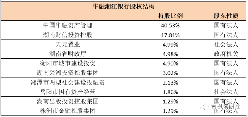 2、2010年10月,湖南省委省政府引入華融資產(chǎn),在重組湖南原株洲、湘潭、衡陽、岳陽市商業(yè)銀行和邵陽市城信社的基礎(chǔ)上新設(shè)而成(即四行一社)。成立時華融湘江銀行的注冊資本為40.80億元,華融占比5098%、四行一社原股東占比41.67%、其他股東占比7.35%。