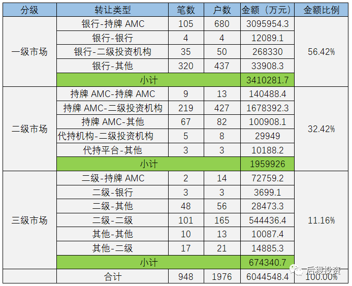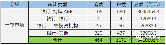 根據(jù)已有數(shù)據(jù)顯示,一級(jí)市場(chǎng)總成交戶(hù)數(shù)1171戶(hù),總成交金額約341億余元,占全年市場(chǎng)交易量56%。其中成交規(guī)模最大的為銀行-持牌AMC,成交金額在一級(jí)市場(chǎng)中占90.8%,但比去年減少約60億元。
