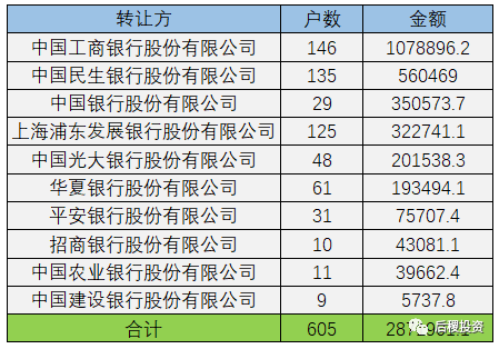 經(jīng)過(guò)數(shù)據(jù)整理我們發(fā)現(xiàn),工商銀行連續(xù)兩年出讓金額保持第一,建設(shè)銀行、招商銀行等的出讓規(guī)模大幅下降,民生銀行出讓規(guī)模上升較多,華夏銀行也略有上升,交通銀行、興業(yè)銀行則跌出了前十。