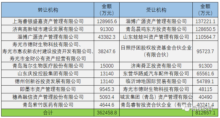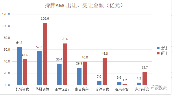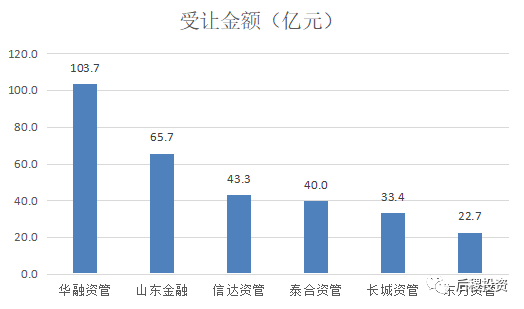 從出讓金額與受讓金額的對(duì)比中看,華融資管、山東金融、泰和資管、信達(dá)資管、東方資管受讓金額均大于出讓金額,則長(zhǎng)城資管、青島資管受讓金額小于出讓金額。