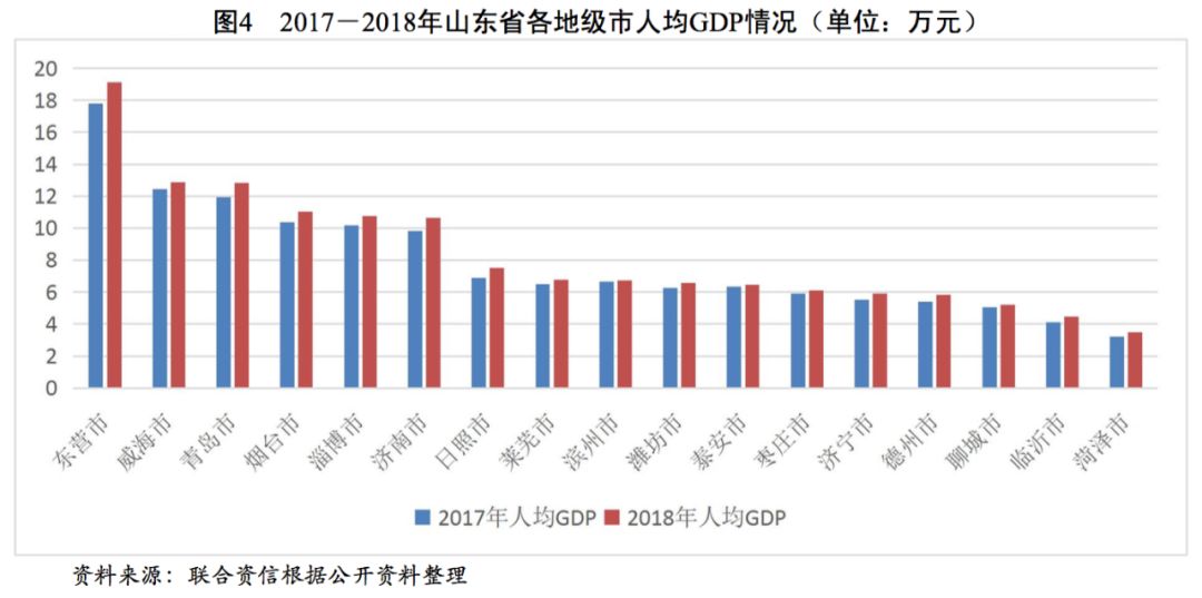 從山東省地級(jí)市GDP方面看,青島市的GDP規(guī)模和增速處于領(lǐng)先地位,2017-2018年,青島市GDP分別為11037.28億元和12001.50億元,GDP增速分別為7.5%和7.4%,2018年青島市GDP占全省的比重為15.69%。濟(jì)南市和煙臺(tái)市的GDP規(guī)模僅次于青島市,2018年,上述兩個(gè)地級(jí)市的GDP規(guī)模分別為7856.56億元和7232.58億元;濰坊市和淄博市的GDP規(guī)模均超過5000億元;GDP規(guī)模在5000~3000億元的地級(jí)市有濟(jì)寧市、臨沂市、東營(yíng)市、泰安市、威海市、德州市、聊城市和菏澤市;日照市、濱州市、棗莊市和萊蕪市經(jīng)濟(jì)實(shí)力較弱,GDP均不到3000億元。總體看,山東省各地級(jí)市經(jīng)濟(jì)分化程度較高,青島市的GDP規(guī)模及增速處于絕對(duì)領(lǐng)先地位,濟(jì)南市、煙臺(tái)市、濰坊市和淄博市經(jīng)濟(jì)體量其次,濱州市、棗莊市、日照市和萊蕪市經(jīng)濟(jì)體量小。從人均GDP來看,2017年和2018年?yáng)|營(yíng)市、青島市和威海市的人均GDP處于省內(nèi)最高,而聊城市、臨沂市和菏澤市規(guī)模最小,人均GDP差異主要為地方經(jīng)濟(jì)實(shí)力及人口規(guī)模等因素所致。
