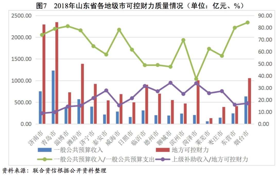 從可控財(cái)力來看,青島市可控財(cái)力最高,2018年為2347.37億元,濟(jì)南市緊隨其后,為2295.81億元,濰坊市、煙臺(tái)市和菏澤市均超過1000億元,其余地級(jí)市中,濟(jì)寧市、臨沂市、淄博市、德州市、威海市、聊城市和泰安市可控財(cái)力在500~1000億元之間。其余地級(jí)市的可控財(cái)力均小于500億元,其中萊蕪市的可控財(cái)力規(guī)模最小,為135.72億元。總體看,山東省各地級(jí)市財(cái)政實(shí)力分化明顯,青島市和濟(jì)南市處于絕對(duì)領(lǐng)先地位。