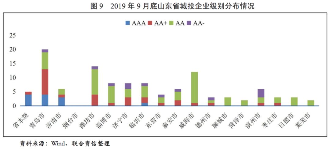 截至2019年9月底,山東省有存續(xù)債且有主體級(jí)別的城投企業(yè)共112家[6]。其中,省本級(jí)城投企業(yè)5家,地級(jí)市本級(jí)城投企業(yè)26家,地級(jí)市下轄區(qū)級(jí)城投企業(yè)30家,園區(qū)城投企業(yè)13家,縣級(jí)市/縣城投企業(yè)38家;主體級(jí)別為AAA的城投企業(yè)12家,主體級(jí)別為AA+的城投企業(yè)27家,主體級(jí)別為AA的城投企業(yè)61家,主體級(jí)別為AA-的城投企業(yè)12家。分地級(jí)市來看,青島市的城投企業(yè)個(gè)數(shù)最多,達(dá)到20家,其次為濰坊市(14家)、威海市(12家)、臨沂市(8家)、淄博市(8家)、濟(jì)寧市(8家)、濟(jì)南市(6家)和濱州市(6家),其余地級(jí)市平臺(tái)數(shù)量相對(duì)較少。從級(jí)別分布看,受區(qū)域經(jīng)濟(jì)及財(cái)政實(shí)力影響,AAA城投企業(yè)主要集中于省本級(jí)及經(jīng)濟(jì)財(cái)政實(shí)力強(qiáng)的青島市和濟(jì)南市,其余地級(jí)市中只有臨沂市有1家AAA城投企業(yè),但臨沂市與其他AAA城投企業(yè)所屬區(qū)域的經(jīng)濟(jì)和財(cái)政實(shí)力的差距較大。除煙臺(tái)市、聊城市、菏澤市、日照市和萊蕪市以外,其余地級(jí)市均有AA+城投企業(yè),煙臺(tái)市無存續(xù)級(jí)別的城投企業(yè),聊城市、菏澤市、日照市和萊蕪市城投企業(yè)最高級(jí)別為AA,級(jí)別為AA-的城投企業(yè)全部位于區(qū)縣、高新區(qū)及經(jīng)開區(qū)。