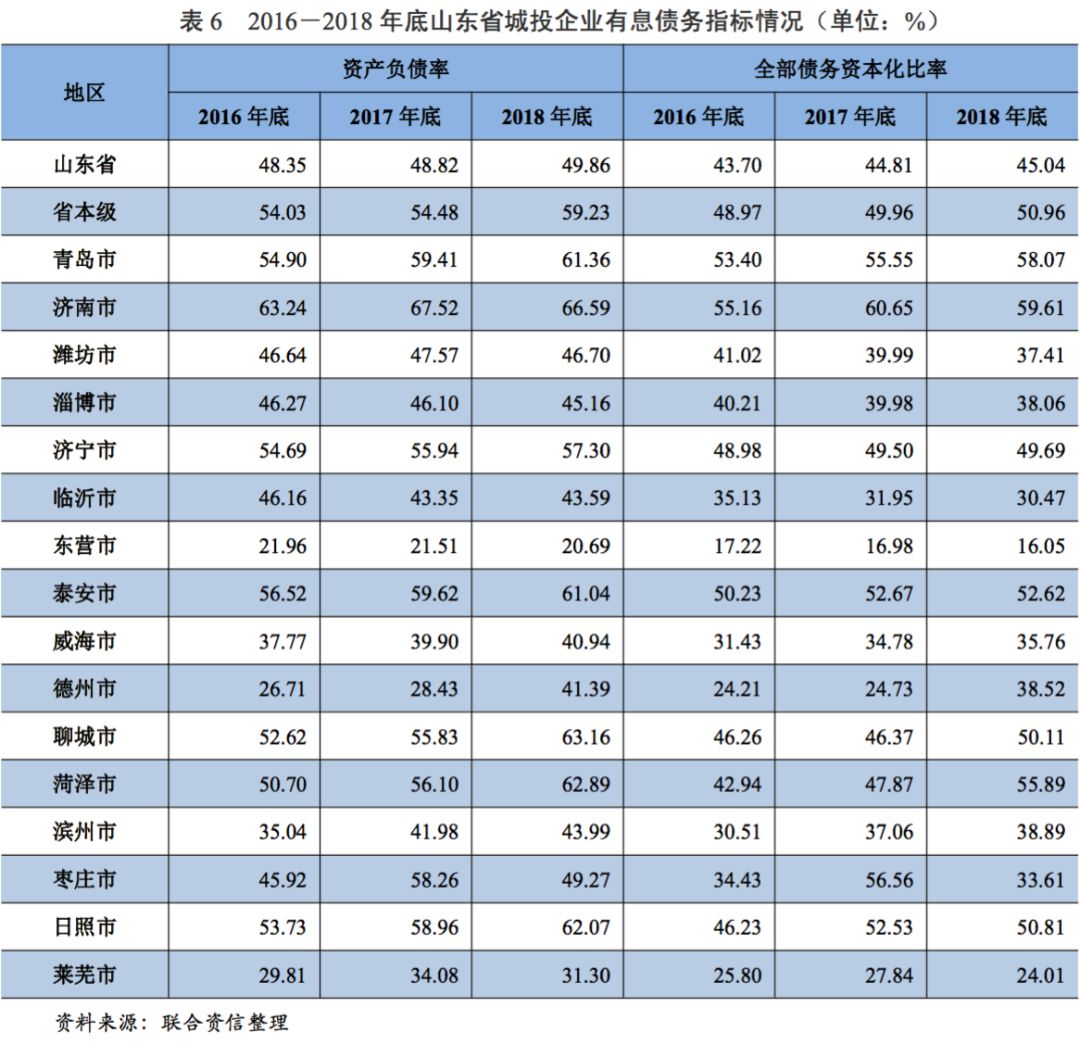 從債務(wù)指標(biāo)看,2016-2018年,山東省城投企業(yè)整體資產(chǎn)負(fù)債率和全部債務(wù)資本化比率均呈上升趨勢(shì),山東省城投企業(yè)債務(wù)負(fù)擔(dān)持續(xù)增長(zhǎng)。從山東省各地級(jí)市城投企業(yè)債務(wù)指標(biāo)看,2018年,青島市、濟(jì)南市、菏澤市、泰安市、聊城市和日照市城投企業(yè)資產(chǎn)負(fù)債率均超過60%,全部債務(wù)資本化比率均超過50%,上述地級(jí)市城投企業(yè)債務(wù)負(fù)擔(dān)較重。