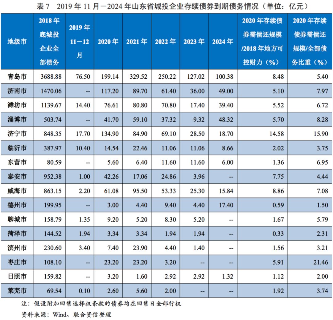 從各地級(jí)市城投企業(yè)存續(xù)債券未來五年(2020-2024年)需償還規(guī)模的分布看,假設(shè)附加回售選擇權(quán)條款的存續(xù)債券均于回售日全部行權(quán),山東省城投企業(yè)將于2020-2022年面臨債券到期高峰,其中濟(jì)寧市短期兌付壓力相對(duì)較高,2020年存續(xù)債券需償還規(guī)模/2018年地方可控財(cái)力的比例為14.58%,其次為威海市、青島市和泰安市,2020年存續(xù)債券需償還規(guī)模/2018年地方可控財(cái)力的比例分別為8.86%、8.48%和7.75%。考慮到山東省城投企業(yè)存續(xù)債券將于2020-2022年面臨集中兌付高峰期,部分地級(jí)市城投企業(yè)的融資壓力將增大,山東省城投企業(yè)未來融資狀況和融資成本變化需密切關(guān)注。