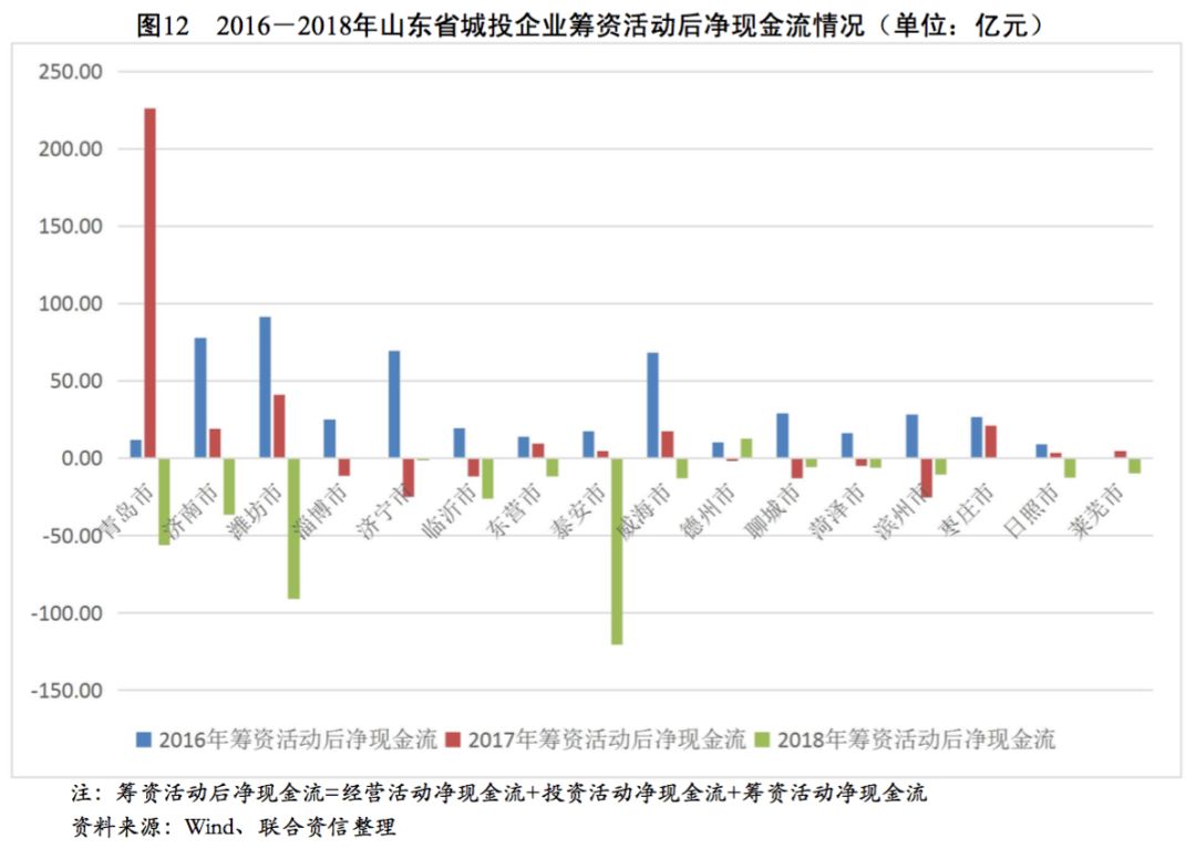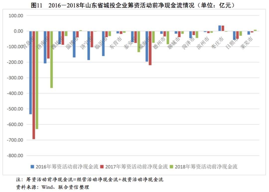 從各地級(jí)市城投企業(yè)籌資活動(dòng)現(xiàn)金流狀況看,2016-2018年,青島市、濟(jì)南市和德州市城投企業(yè)籌資活動(dòng)現(xiàn)金流入波動(dòng)上升,年均復(fù)合增長(zhǎng)率分別為13.80%、11.08%和65.37%,其余地級(jí)市城投企業(yè)籌資活動(dòng)現(xiàn)金流入均呈波動(dòng)下降趨勢(shì),山東省大部分地級(jí)市城投企業(yè)籌資力度有所下降。反觀籌資活動(dòng)現(xiàn)金流出情況,近三年除臨沂市、東營(yíng)市、泰安市和棗莊市城投企業(yè)籌資活動(dòng)現(xiàn)金流出有不同程度下降外,其余地級(jí)市城投企業(yè)籌資活動(dòng)現(xiàn)金流出均有所增長(zhǎng)。受流入減少、流出增多趨勢(shì)的共同影響,山東省大部分地級(jí)市城投企業(yè)籌資活動(dòng)凈現(xiàn)金流均大幅下降,但經(jīng)濟(jì)實(shí)力較強(qiáng)的青島市和濟(jì)南市仍保有較大規(guī)模的籌資活動(dòng)現(xiàn)金凈流入。從籌資活動(dòng)前凈現(xiàn)金流看,2018年除淄博市和萊蕪市為凈流入以外,山東省其余各地級(jí)市均為凈流出態(tài)勢(shì),其中青島市、濟(jì)南市和泰安市資金缺口最大。從籌資活動(dòng)后凈現(xiàn)金流來看,2016-2018年,山東省地級(jí)市城投企業(yè)籌資活動(dòng)后凈現(xiàn)金流整體呈下降趨勢(shì),其中青島市、濟(jì)南市、濰坊市、泰安市和臨沂市在2018年降幅明顯,上述地級(jí)市的城投企業(yè)融資壓力明顯加大。