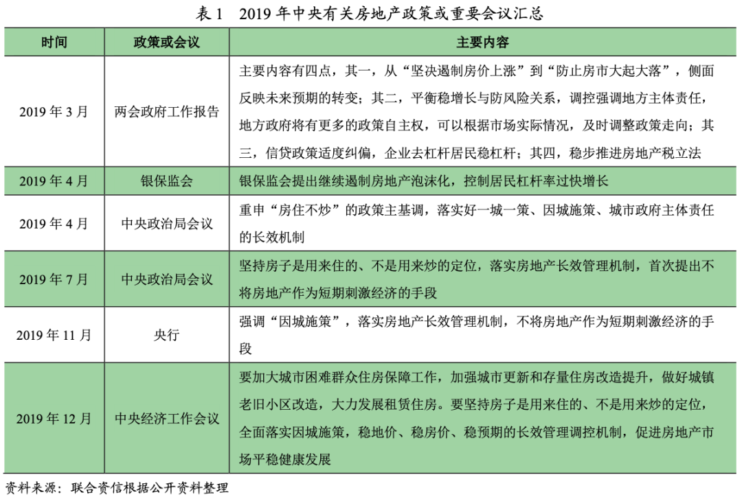 2019年以來,中央堅持“房住不炒”的政策總基調(diào)不變。從中央的調(diào)控思路看,中央對房地產(chǎn)泡沫化所帶來的金融風險、居民杠桿率快速增長等問題表現(xiàn)出了極大的重視,是本輪房地產(chǎn)企業(yè)融資端調(diào)控政策的起點;6月份以來,促進國民經(jīng)濟戰(zhàn)略轉(zhuǎn)型訴求納入監(jiān)管層的視野,壓縮房地產(chǎn)金融資源以促進國民經(jīng)濟轉(zhuǎn)型亦成為政策調(diào)控的重要考慮因素。2019年7月,中央政治局會議首次提出“不將房地產(chǎn)作為短期刺激經(jīng)濟的手段”;從2019年三季度開始,宏觀經(jīng)濟下行壓力大,政府加大逆周期調(diào)節(jié)力度,9月全面降準+LPR降息,11月MLF降息,房地產(chǎn)政策向“松緊對沖”過渡。具體內(nèi)容如下表所示。