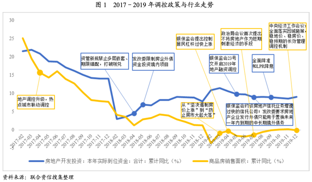自2016年首提“房住不炒”以來,2017年調(diào)控升級,熱點城市聯(lián)動調(diào)控,2018年資管新規(guī)打破剛兌,禁止多層嵌套以及期限錯配。2019年,商品房累計銷售面積首次出現(xiàn)負增長,具體政策和行業(yè)走勢對應(yīng)如圖1所示。