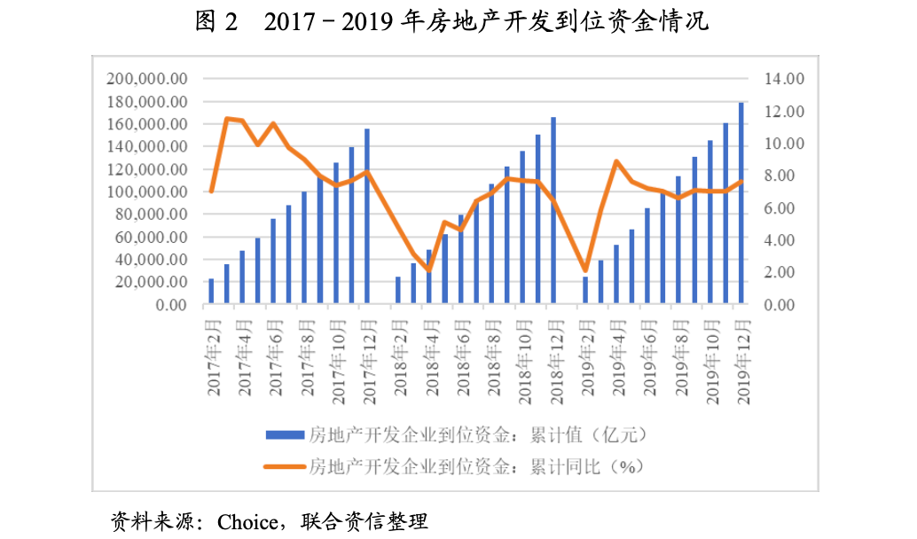 宏觀環(huán)境方面,2019年以來,貨幣政策整體寬松,全年三次降準,LPR的推行使得利率市場化更近一步,財政政策更為積極主動,大規(guī)模的減稅降費政策降低企業(yè)負擔,帶動實體企業(yè)企穩(wěn)回升。房企融資方面,2019年整體呈現(xiàn)先揚后抑的態(tài)勢,年初房企融資延續(xù)了2018年的回暖態(tài)勢,出現(xiàn)了“小陽春”,但從二季度開始迎來了新一輪更加嚴峻的調(diào)控,針對房地產(chǎn)的融資政策更為嚴格,對房企融資端的監(jiān)管進一步加強,意在遏制房地產(chǎn)泡沫化傾向、防范房地產(chǎn)金融風險。2019年房地產(chǎn)開發(fā)到位資金同比增長7.6%,比2018年增長1.2個百分點。